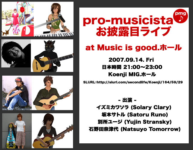 この度、私の先輩やお友達のミュージシャンを呼んで、セカンドライフ6組で「pro-musicista」というグループを作りましたっ。