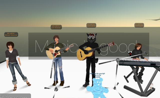 この度、こうやってお友達のアーティストに声をかけたのは、セカンドライフの中で、海外のアーティストはたくさんいるのに、まだまだ日本のアーティストは少なくて、「こんなに楽しいのに!! もっと仲間が増えたらなぁ。もっとたくさんの人と一緒にライブが出来たらなぁ。。」という所からでした。